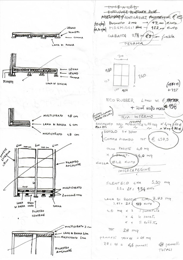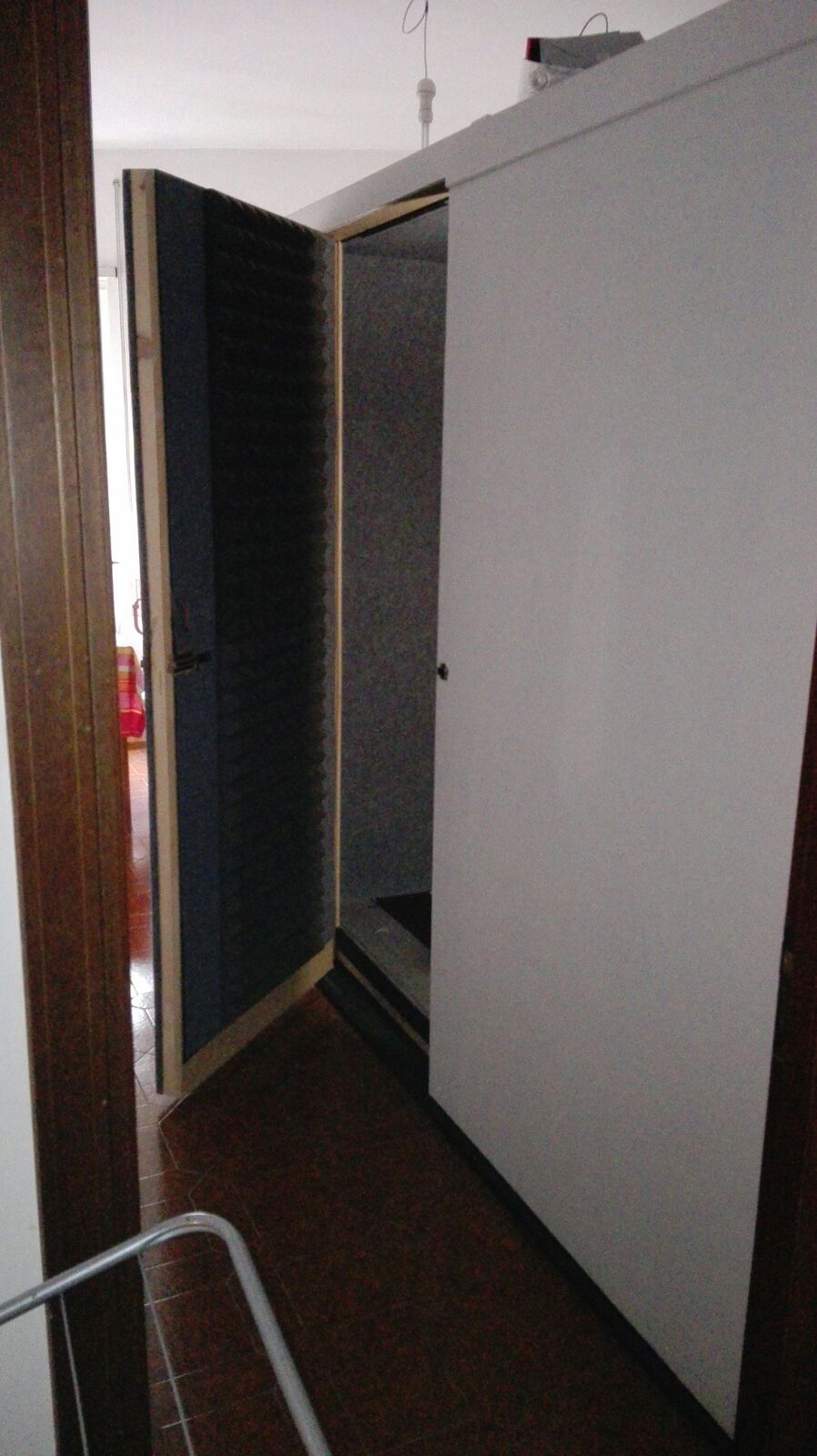 Il pavimento flottante era in pioppo e poggiava su uno strato di gomma; le 4 pareti e il soffitto erano costituite dal classico “panino” in legno multistrato e lana di roccia; per migliorare l’isolamento, internamente usai pure la gomma piombo come rivestimento; su cui poi incollai un feltro più che altro decorativo e dei piramidali che servono invece per impedire che le onde sonore, rimbalzando sulle pareti, possano tornare indietro e farti diventare scemo. A completare l’opera una ciabatta elettrica a cui collegavo una lampada a led e un ventilatore (quanto comfort!). Devo dire che il risultato finale fu sopra le aspettative, sia dal punto di vista estetico che dal punto di vista funzionale.