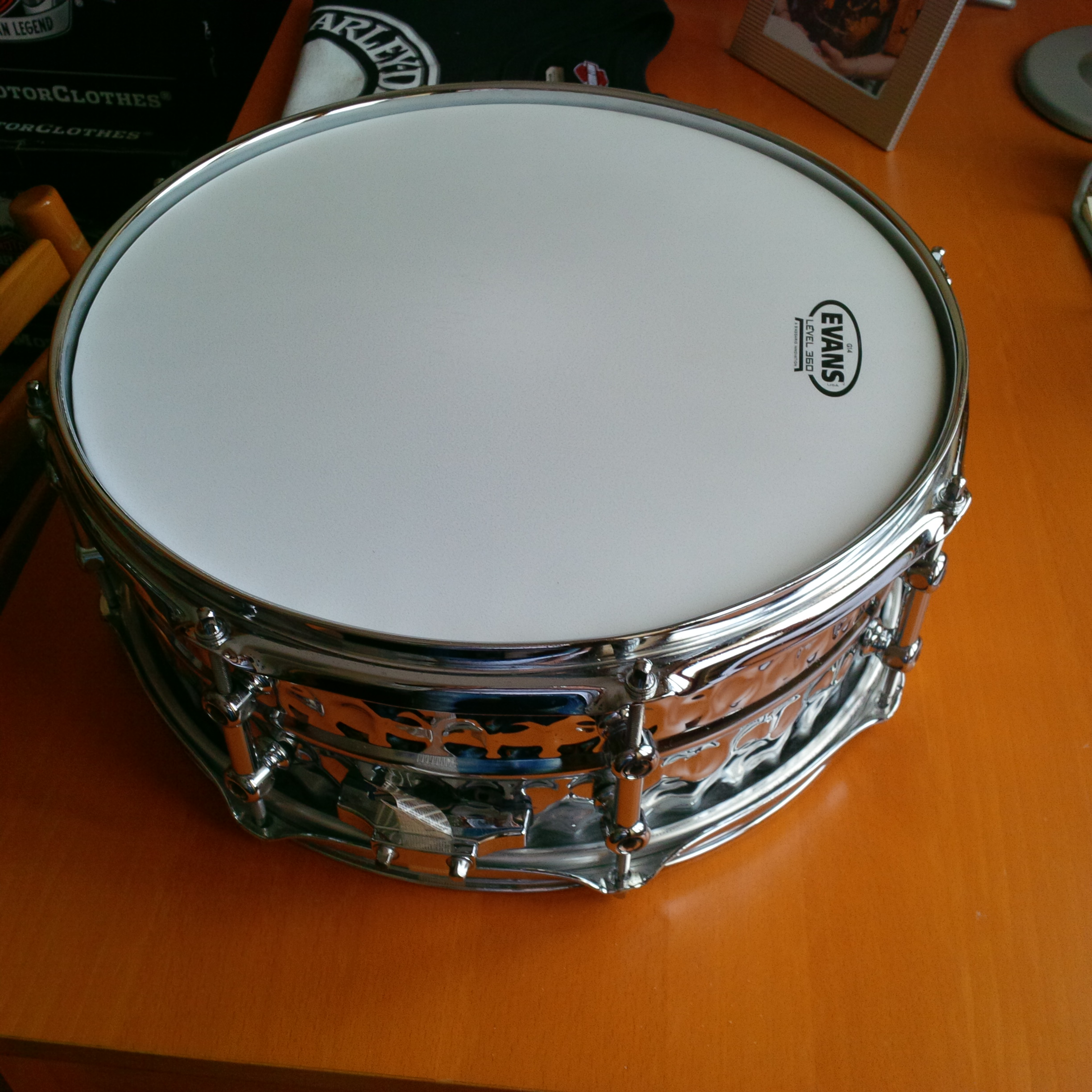 A quel punto mancava il rullante, il tamburo con cordiera con cui tipicamente nel rock si batte il backbeat (il 2 e il 4, la faccio semplice). Quello lo cambiai mesi dopo: mio cugino Matteo, lui sì batterista professionista e oggi fresco di laurea al conservatorio, mi convinse a comprare un rullante in metallo, credo sia alluminio. Molto bello esteticamente e anche versatile, a sentir lui. Io all’epoca non sapevo esattamente cosa intendesse (ora comincio ad averne una vaga idea). Di certo ha un volume pazzesco, in genere i rullanti in metallo hanno un volume maggiore rispetto a quelli in legno, oltre che un suono meno caldo e armonici meno controllati. Forse è troppo squillante, rispetto ai tom, e non sono mai soddisfatto fino in fondo della cordiera, nonostante ci abbia perso tempo diverse volte alla ricerca della giusta tensione (e quindi del giusto suono). Un giorno o l’altro cambierò anche quella (o forse comprerò un altro rullante). Anche qui c’è poi da considerare la variabile pelle, ma per mia fortuna già ne montava una ottima. Comunque è il rullante che uso ancor oggi e ho capito che mi piace tenerlo medio-alto, come accordatura.