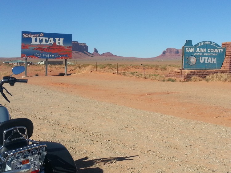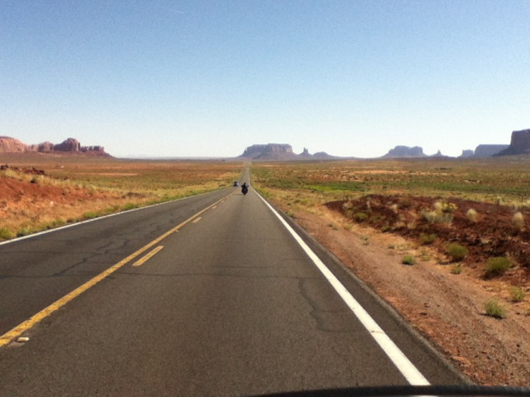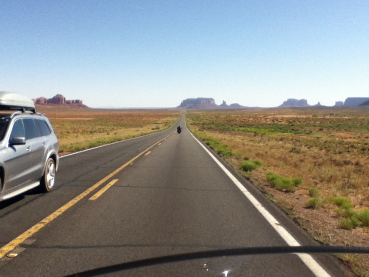 Il giorno dopo passammo nuovamente per la 163 diretti verso il nord dello Utah, alla volta dei parchi Canyonlands e Arches. Superata la deviazione per il Visitor Center della Monument Valley si fanno un paio di curve, poi lo scenario si apre e si percorre il tratto di 163 forse più famoso, immortalato in Forrest Gump e chissà quanti altri film. Dapprima la strada scende, poi impercettibilmente risale; in cima alla salita parcheggi la moto (o l’auto) e ti giri indietro. Ecco un altro di quei punti che avrai visto centinaia di volte nei film, sulle riviste di viaggi, o su internet e sui social. L’impressione è quella di scendere fisicamente nella valle, con quella cornice scenografica di sagome frastagliate e improbabili sullo sfondo. Il colpo d’occhio da qui è notevole, ma mi va di dire che le sensazioni più belle per me si provano in quei primi chilometri da Kayenta fino alla valle dei giganti di roccia che sfidano l’eternità.