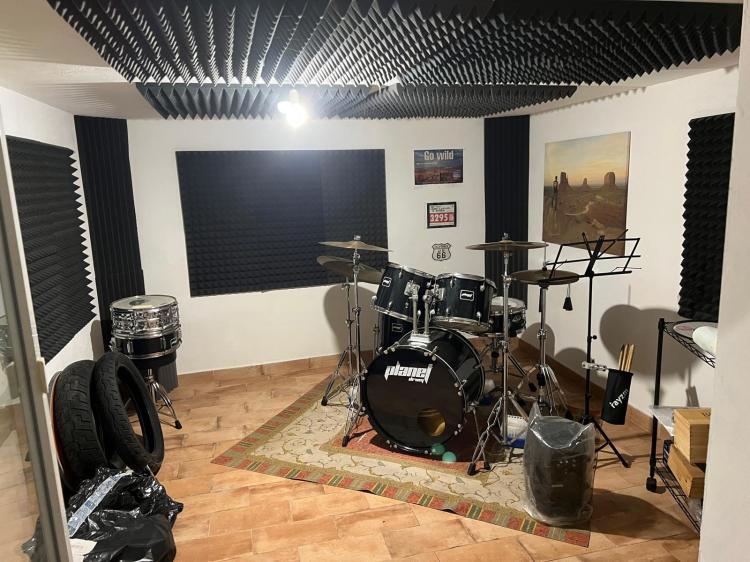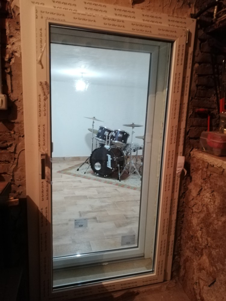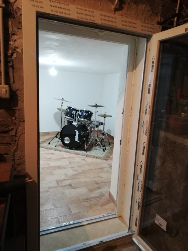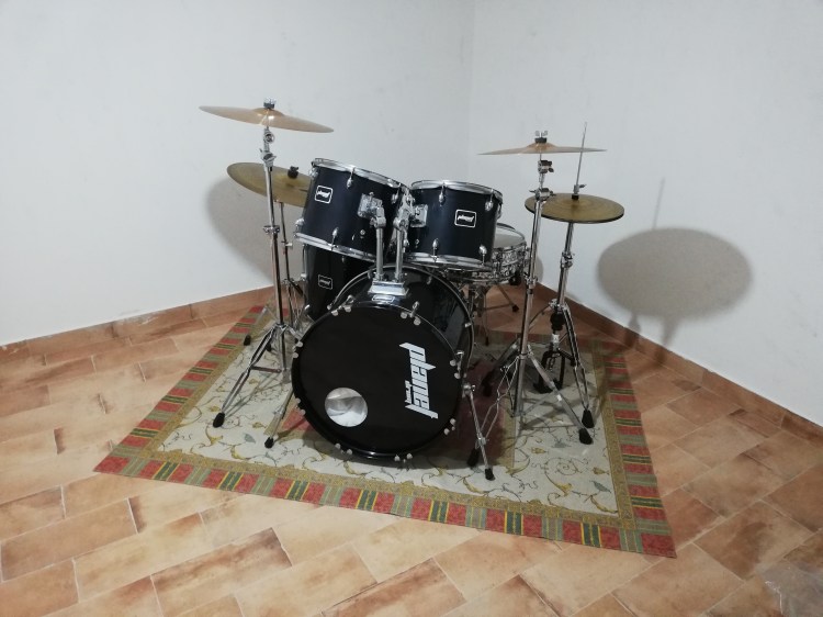 Breve inciso: a furia di tenere in mano le bacchette, la edrum non mi bastava più. Così ho dato una ripulita a una piccola cantina e l’ho adibita a saletta dove poter studiare. Stavolta è stato tutto più semplice, rispetto alla costruzione del box: essendo semi interrata, l’isolamento acustico su 3 dei 4 lati veniva da sé; ho dovuto soltanto far mettere in opera dei pannelli di cartongesso e comprare le doppie porte insonorizzate per isolare bene anche il quarto. Anche stavolta risultato strepitoso, e qui davvero riesco a studiare senza remore. Per l’umidità, che è inevitabile, ci sono comunque dei rimedi (anche se parziali). Quando mi chiudo lì sotto pesto di brutto. Come potete vedere, la batteria è quella di sempre. Non potevo più andare avanti solo con quella elettronica, sapendo di avere quella vera a cui sono molto legato smontata da qualche parte. Forse un giorno, quando mi sentirò all’altezza, comprerò anche una batteria migliore. Per il momento la mia vecchia batteria “che costava meno di un telefonino” va ancora bene.