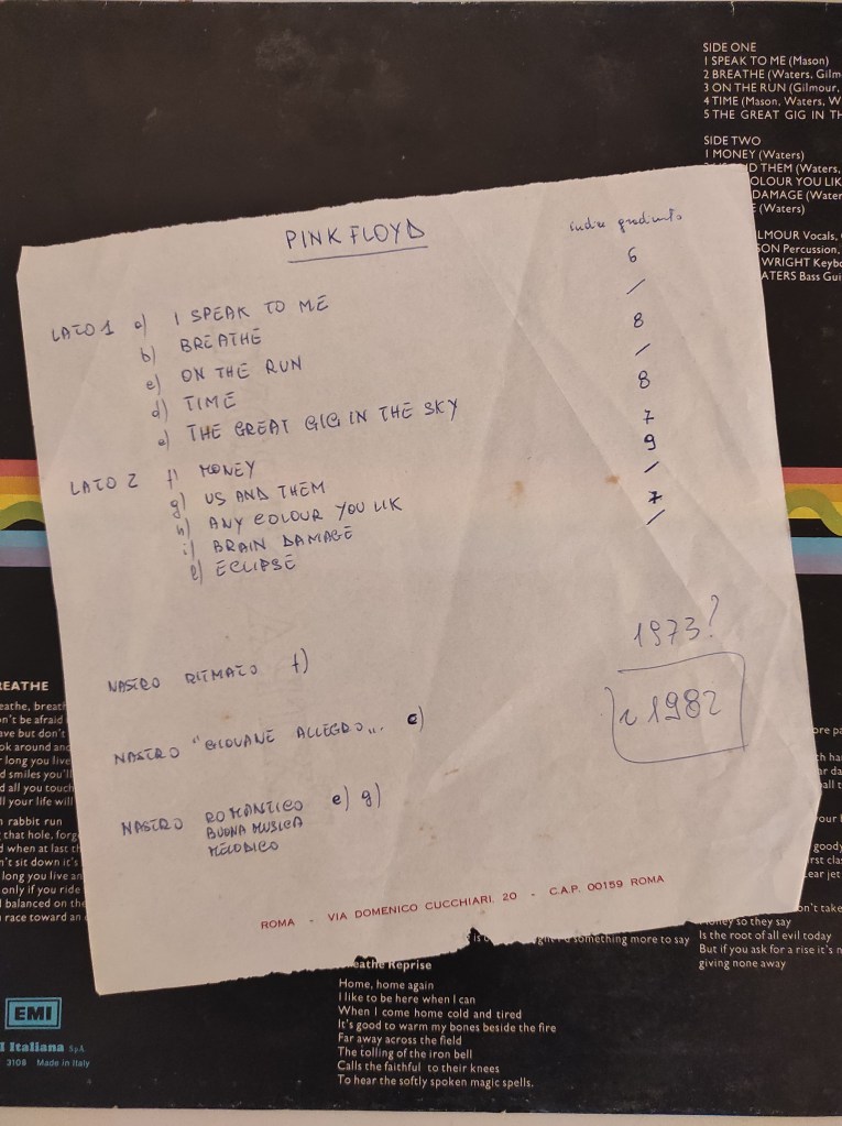 Mi aspettavo un disco tradizionale, mi sono ritrovato catapultato nel fascino magnetico e misterioso del “disco del prisma”, con un battito cardiaco ad aprire e chiudere, brani di lunghezza “irregolare” con confini indefiniti e che sfumano l’uno nell’altro, suoni strani provenienti dal futuro, un brano urlato a squarciagola, inserti audio di gente che diceva cose che naturalmente non capivo, sveglie che suonano all’unisono, tintinnio di monete e altre trovate inaspettate. Decisamente troppo, per le mie orecchie e la mia mente di adolescente che all’epoca andava matto per il greatist hits dei Queen.