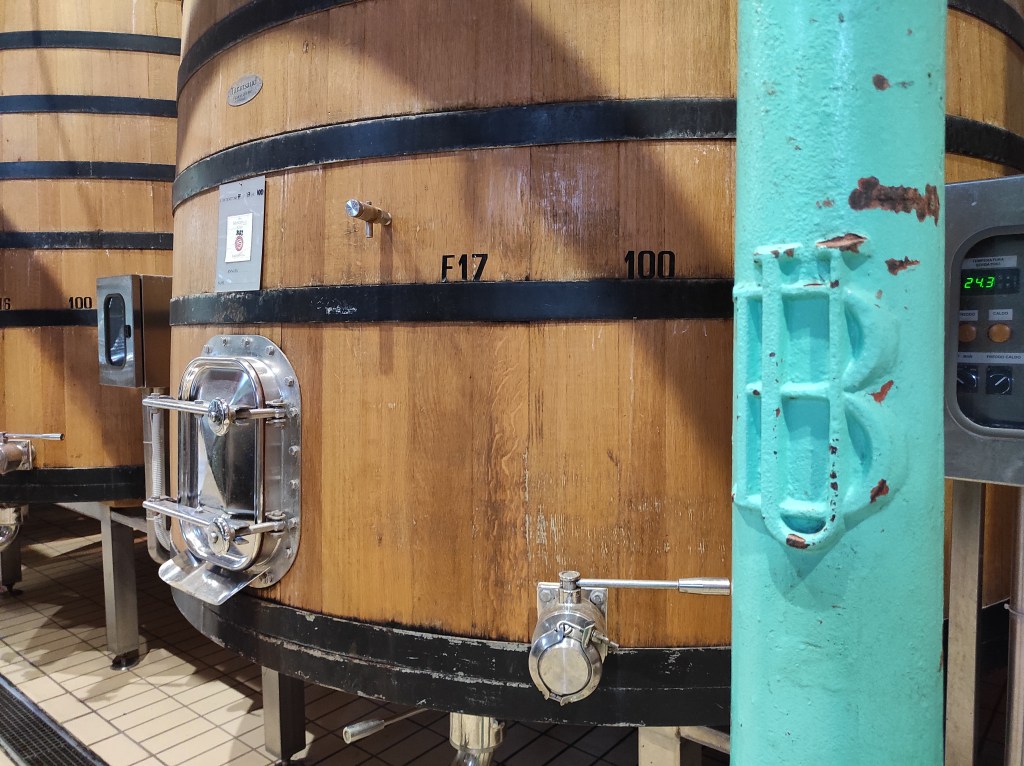 Entrando passiamo innanzitutto dalla sala vinificazione, con grandi tini in legno e silos di acciaio per la fermentazione. In virtù della conformazione della cantina, le operazioni di lavorazione delle uve avvengono per gravità. La pavimentazione è recente, per garantire adeguati livelli di pulizia e igiene del locale, mentre le capriate del tetto sono quelle originali.