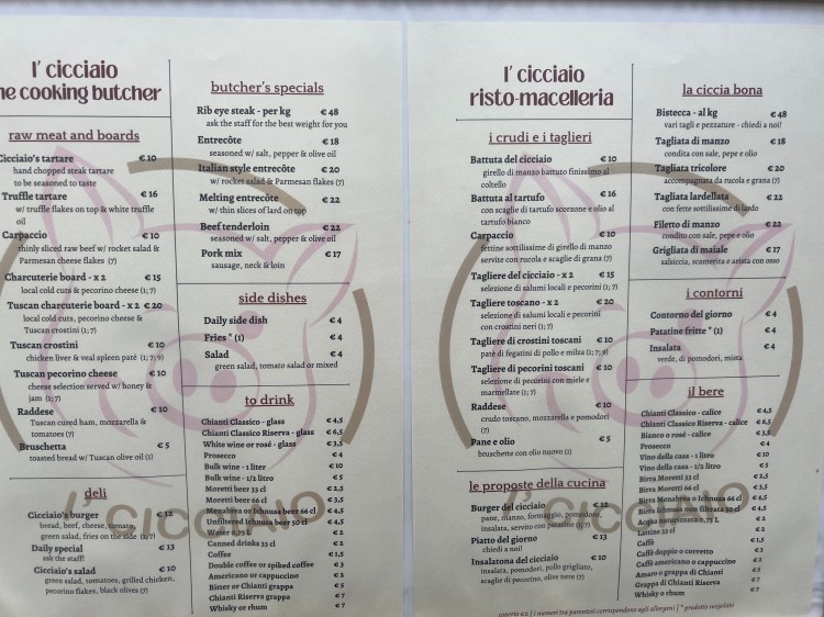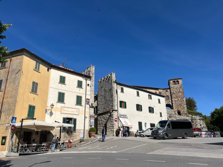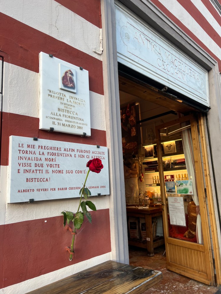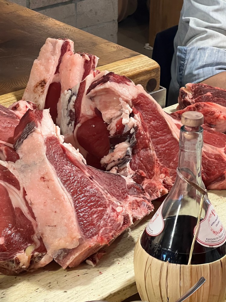 Scesi in paese e trovato parcheggio, la prima tappa era la Macelleria Rocchigiani per il pranzo. Nonostante l’animale non fosse cotto sulla brace ma su una piastra a induzione (“io so’ in centro, un me la fanno fare la brace”), la bistecca era notevole e devo dire ottima anche la bottiglia di Chianti Classico Castello di Ama con cui abbiamo inaugurato le sbevazzate. A fine pasto “i’ cicciaio” ci ha raccontato un pò i segreti della sua arte, rivelandoci tra le altre cose che lui macella solo carne Limousine e “solo animali femmine” (non saprei dire se si tratta di un rigurgito di patriarcato, in ogni caso sono sue parole… io, semmai, ho la sola responsabilità di averle riportate).