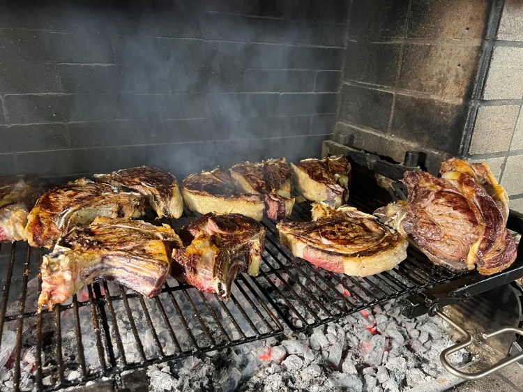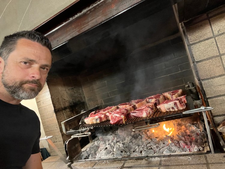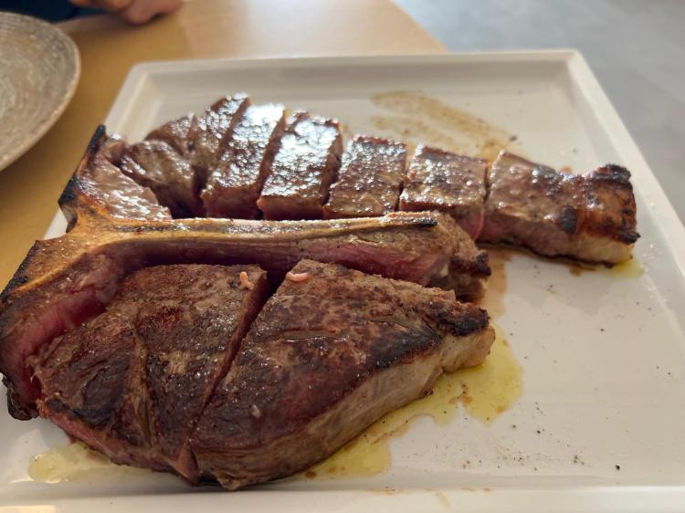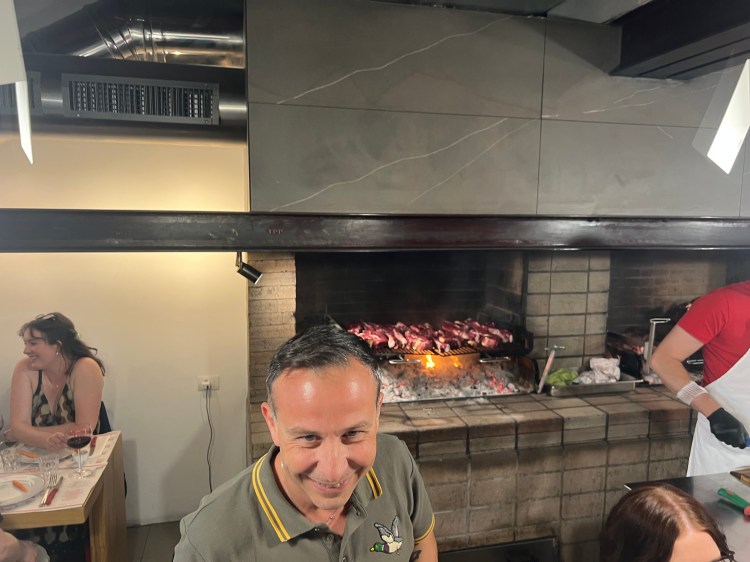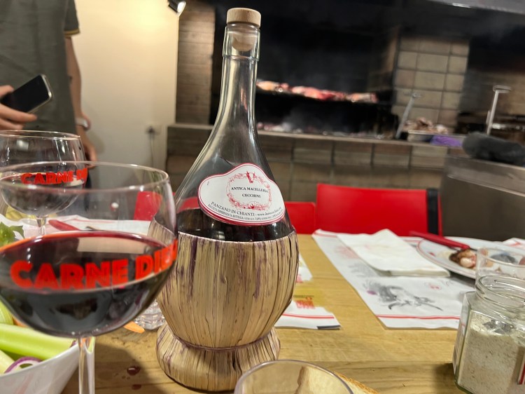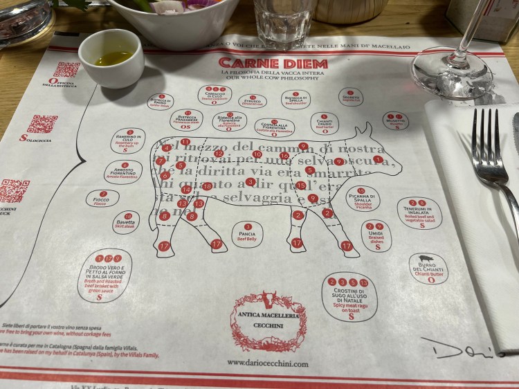 Da lui le cose si svolgono così: lunga tavolata, si mangia tutti insieme fianco a fianco con persone che ovviamente non conosci (per lo più stranieri, c’erano persone dagli USA, dal Sudafrica e persino una vegana). Il figlio cuoce sulla brace e affetta davanti a te, gli aiutanti servono ai commensali un paio di porzioni per ogni taglio. In tutto assaggi sette o otto parti diverse di animale, non solo la celebre Fiorentina, ovviamente se vuoi il bis non te lo negano. Il vino lo puoi portare tu, altrimenti ti servono quello della casa nei fiaschetti. Chiudono il menu un dolcetto, caffé, grappa e vin santo. Totale, oneste 50 euro.