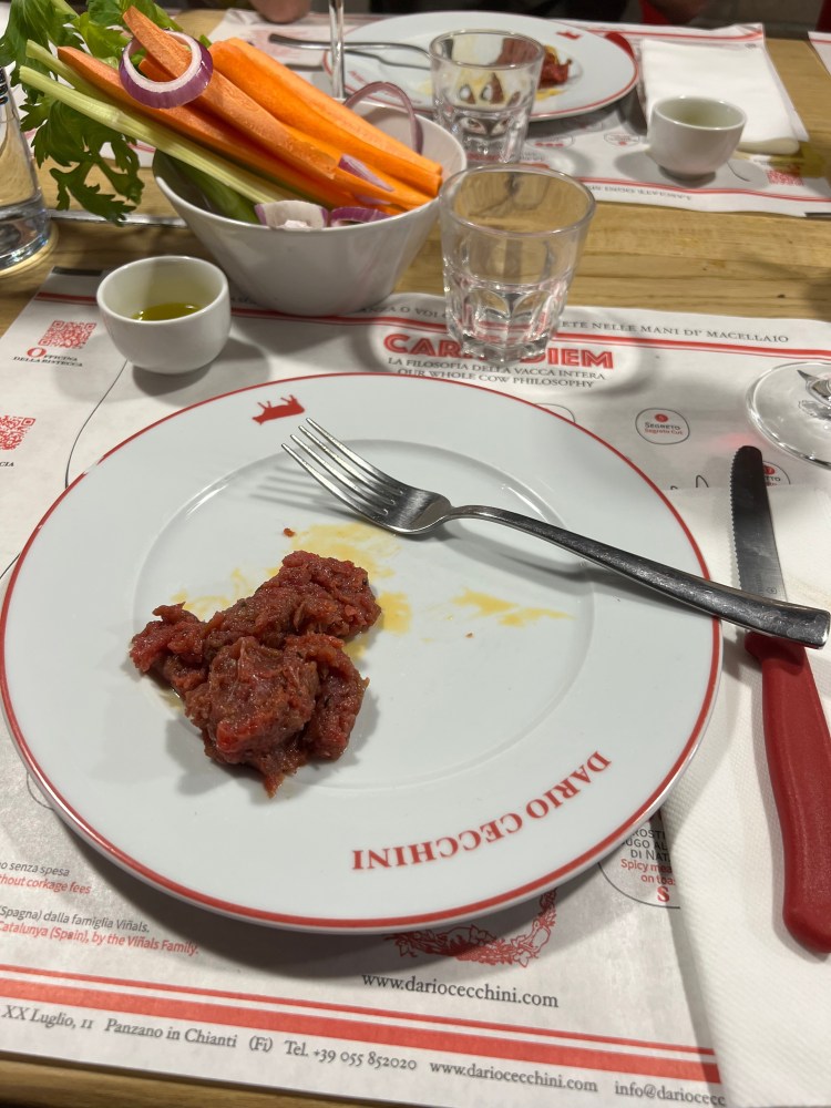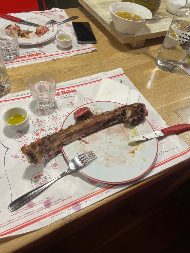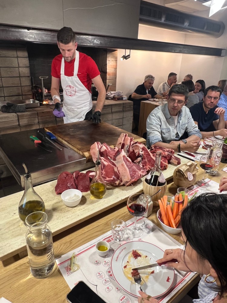 Cecchini ormai non fa più il servizio, però sale per un giretto a salutare tra gli applausi degli avventori. Nel complesso si tratta di una esperienza culinaria insolita e per certi versi estrema, conviviale e divertente. Per dire, vicino a noi c’erano una coppia di vichinghi danesi, mai visti né conosciuti prima ovviamente. Mentre mangiavamo lui mi ha raccontato che il giorno dopo sarebbero venuti a Roma, io ho insistito affinché memorizzasse i miei contatti (aziendali…) tramite il QR code del mio bigliettino da visita. “Anything will go wrong but if you’ll need something, once in Rome, feel free to contact and ask me everything”… a fine serata ricordo di avergli detto qualcosa del genere, amici amici insomma.