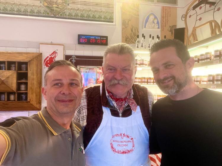 Di lui ha scritto persino Seth Godin nel suo best seller “La mucca viola” (chi sa di marketing sa di cosa si tratta), però devo ammetterlo: non conoscevo il personaggio prima che me ne parlasse Massimiliano. Cecchini é famoso (forse persino più all’estero che in Italia) per il fatto di affettare carni recitando con gran prosopopea i canti della Divina Commedia, e per un approccio umanista alla macellazione. Ci vogliono mesi di anticipo per trovare posto e infatti un mese e mezzo prima, quando chiamammo, ci dissero che era tutto pieno. Tuttavia, trovandoci a passare di lì, volevamo comunque fermarci per salutarlo.